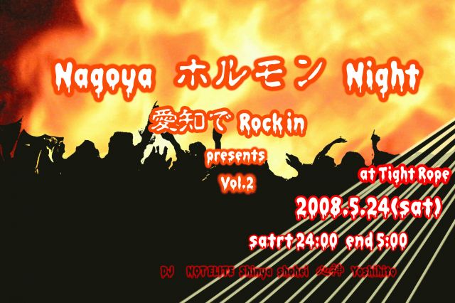今度5月24日の土曜日24:00から5:00にかけて 【Nagoya ホルモン Night 愛知でロックインpresents Vol.2】 http://mixi.jp/view_diary.pl?id=797772480&owner_id=5535732 を行いますが、今回プレパーティーということで、 5月20日の火曜日に同じTightRopeをお借りして楽しみたいと思いますー★ 【Nagoya ホルモン Night Pre Party】 【日時】2008年5月20日(火) 19:00-23:00 ※終電前には終わります 【場所】TightRope(名古屋市栄) http://www4.ocn.ne.jp/~sogei/ 名古屋市中区栄4丁目3-15丸美観光ビル3.5F 【チ