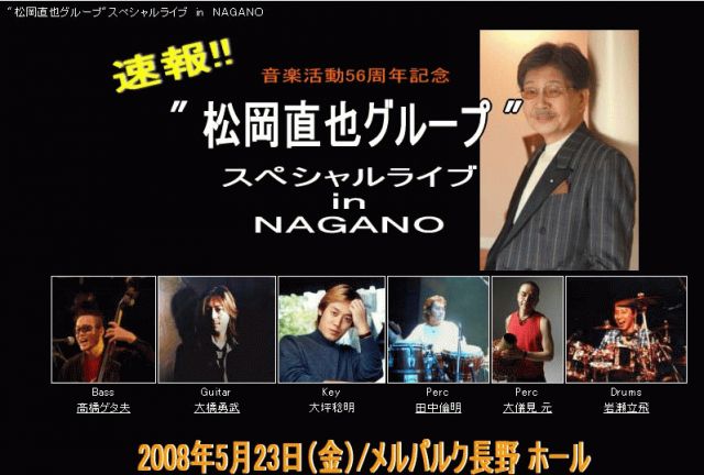 松岡直也サウンドの核となる“松岡直也グループ” 久々のホールコンサート開催が決定しました。 しかも長野には、あの”駒ヶ根”以来の登場となります。 メンバー7人から生まれるロック色の強いレパートリーと、オリジナルのラテン・フュージョン。美しいメロディに躍動感溢れる軽快なリズム、他には類を見ない独創的なサウンドを是非お楽しみください! お見(お聴き)逃しなく! ということで、正式開催の運びとなりました。 個人的には、音楽のことをいろいろ教えていただいた松岡さん、松岡ファミリーそしてANTの方々に心よりお礼
