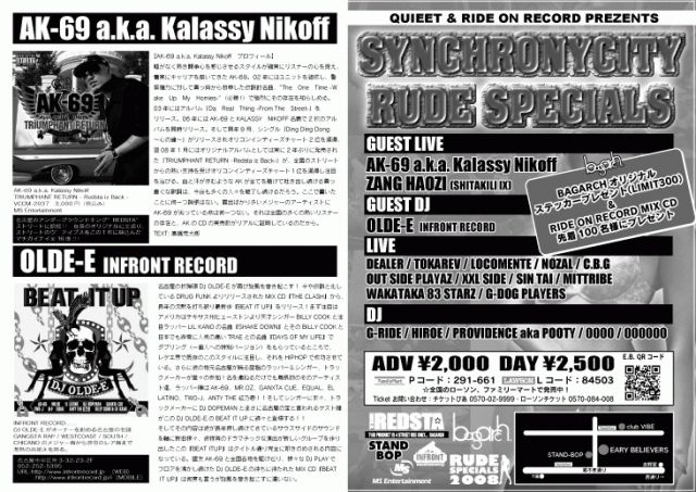 SYNCHRONYCITY RUDE SPECIALS 2008年5月23日(金) 福岡 @ EARY BELIEVERS OPEN 22:00〜 ・場所: 福岡 @ EARY BELIEVERS 〒810-0001 福岡県福岡市中央区天神3丁目5-19 TEL 092-738-7337 WEB : http://www.e-b.jp/index_pc.php ・チケット: 前売り 2,000円 当日 2,500円 Withフライヤー 2,500円 ローソンチケット : 0570-084-008 (Lコード 84503) チケットぴあ : 0570-02-9999 (Pコード 291-661) BAGARCHオリジナルステッカープレゼント(限定300枚) & RIDE ON RECORD MIX CD先着100名様にプレゼント!!