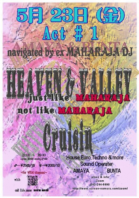 今年3月にプレ・スタートしたこのイベント、なんだか思った以上の反響に驚いています やりますよ23日に 前回同様、このイベントでしか味わえない音空間を体験しに来て下さい 【EVENT DETA】 PLACE: Discoteque Bar★★Zoom★★ DATE: 5月23日 20:00(OPEN) 21:00〜MIDNIGHT ADDRESS: 千葉県千葉市中央区登戸1−13−22の2階 (↑以前の三浦カズヨシ氏の住所・・・ロス疑惑の・・・) TEL: 043−244−9990 男性2500円(1D) 女性2000円(1D) ☆AMAYAか