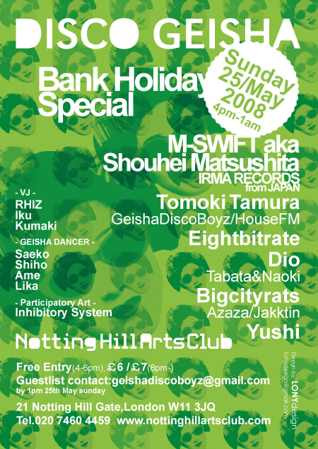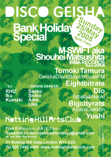 今月のDisco GeishaはBank Holiday Specialです。大変混雑が予想されますので、早めの御来場をオススメします。
