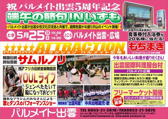 ★夜8時から開催される【島根ジェンベワークショップ】の前のお昼時、【YOUL(ユール)】のライブが出雲駅前広場で見られます(入場無料)! 今回は鳥取・倉吉のグループ【AYA(アイヤ)】との共演です。 せっかくワークショップにいらっしゃるなら…また自分は叩かないけれど見たい!という方も是非お越し下さい。美味しいものもありそうですよ(笑)。 祝 パルメイト出雲5周年記念 端午の節句 IN いずも http://uruma.ap.teacup.com/waraba/375.html パルメイト出雲が出雲女性文化交流会と共催で、 国際色豊かな盛り沢山のイベント