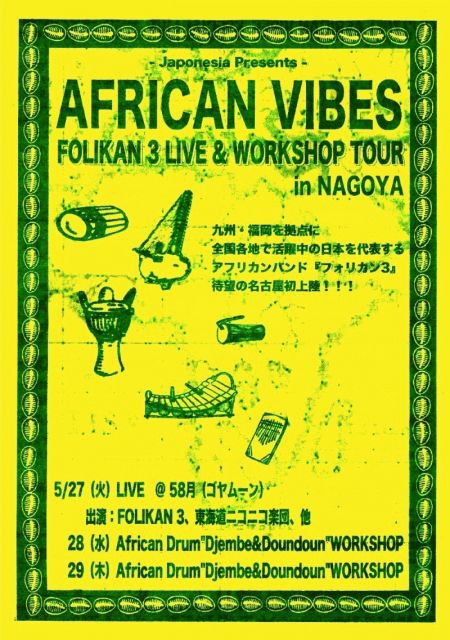 管理人さん、告知失礼致します。 よろしくお願いします。 ♪フォリカン3 LIVE & WORKSHOP in NAGOYA♪ 九州・福岡を拠点に全国各地で活躍中の 日本を代表するアフリカンバンド『フォリカン3』 待望の名古屋初上陸!!! 『FOLIKAN 3(フォリカン スリー)』 1999年夏、西アフリカ・ギニアのジェンベマスター、ママディ・ケイタ氏の命名によ り福岡を拠点に精力的に活動中のアフリカンバンド”フォリカン”。そのパワフルか つ躍動感溢れるパフォーマンスとはまた別に、アフリカの生メロディ‐楽器を使っ た、アフリカン・ト