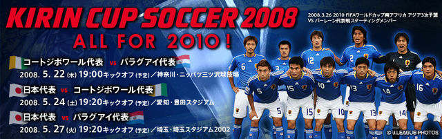【キリンカップ】 5/24 コートジボワール戦[愛知・豊田スタジアム ] 5/27 パラグアイ戦[埼玉スタジアム] 海外組も3名召集され、2010年ワールドカップ アジア3次予選残り4試合(6/2,6/7オマーン戦、6/14タイ戦、6/22バーレーン戦)に向け、どんな戦いを見せてくれるか楽しみなキリンカップ 《代表メンバー》 GK: 川口能活(磐田) 楢崎正剛(名古屋) 川島永嗣(川崎) DF: 寺田周平(川崎) 中澤佑二(横浜FM) 田中マルクス闘莉王(浦和) 駒野友一(磐田) 阿部勇樹(浦和) 井川