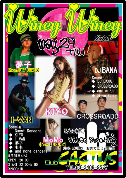 −5/29(木)− 『Winey Winey』 OPEN20:00〜 START22:00-5:00 \2000/1drk -SOUND- ・DJ BANA ・CROSSROADD ・SCREW HEAD ・DISCO BERRY -DANCER- ・KIYO(From LOVE MILK) ・夢子(From FRY GIRLS) ・I-VAN ・MoMo(From LUXURY) and More dancers... ワイニーズによるワイニーズのためのワイニーワイニーナイト!!! 90's〜'08BRAND NEWまで楽しめます! ※ドレスコード:イケイケ フロアで輝いている方には… 【CACTUSから2008年顔パス券贈呈】 さらに… 【Winey Wineyからも何や