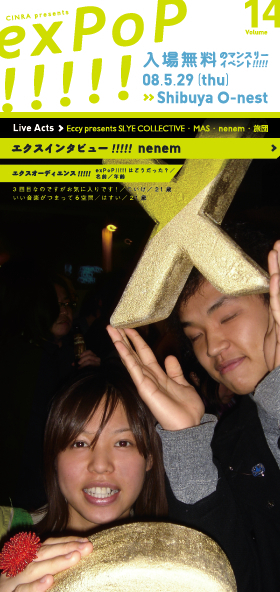MAS、旅団、nenem、Eccyが出演する入場無料イベントの告知をさせてください! ■CINRA presents 「exPoP!!!!!」 日本の音楽シーンには、まだまだ一般的には名の知られていない素晴らしいアーティストが数多くいます。そうしたアーティストたちの音楽を生で体感してもらうべく、入場無料のマンスリーイベントを開催しています。出演アーティストを知らない人、ライブハウスに行ったことがない人、是非ともご来場下さい! 08.05.29 (thu)@Shibuya O-nest CINRA presents 「exPoP!!!!! volume14」 OPEN 19:00 / START 19:30 入場無料 (wit