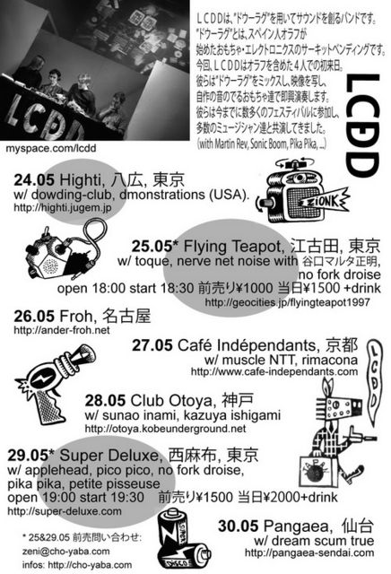 今週5/29(木)、スペインからやってきたゆかいなバンド LCDDのJAPANツアーにアプヘが参加しま〜〜っす!! http://www.myspace.com/lcdd 日頃サーキットベンディングにいそしむzeniちゃんからのお誘いで、 @Super Deluxeと来れば、楽しくない訳がないっ! LCDDの自作楽器ドウーラグ!ヤバ!しびれりゅ〜〜〜!! http://www-us.flickr.com/photos/papelcontinuo/sets/953565/ しかも対ばんも全員、すてきにppってます! さらーに。appleheadは秋に1stアルバムのリリースを控えてまして(わ〜い!) 9月13日(土)のレコ発ライブまで、し