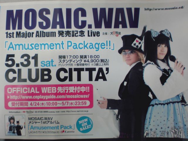 開場17:00 開演18:00 オールスタンディング¥4900(税込)※ドリンク代別 OFFICIAL WEB先行(4/24 10:00〜) http://www.cnplayguide.com/mosaicwav/ 職場にあるCNのポスターに書いてあったので、取り急ぎ報告までに。