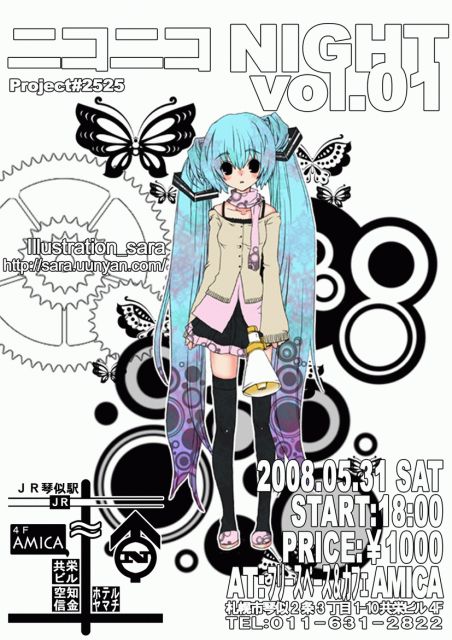 この度、ニコニコ動画をクラブ&ライブ形式で楽しもう!という事で、 イベントを企画しましたので、お知らせいたします。 コスプレの事前申請に関する項目を追記しました。(5/13) ■□■□■□■□■□■□■□■□■□■□■□■□■□■□■□■□■□■□■□■□■ イベント名:「ニコニコNight#01」 主催:project#2525 イベント内容: イベントフリースペースを貸しきりまして、 クラブ&ライブ形式でニコニコ動画を楽しもう!と言った内容です。 DVJスタイルでプロジェクターにニコニコ動画を流しつつ、合唱あり、 コス