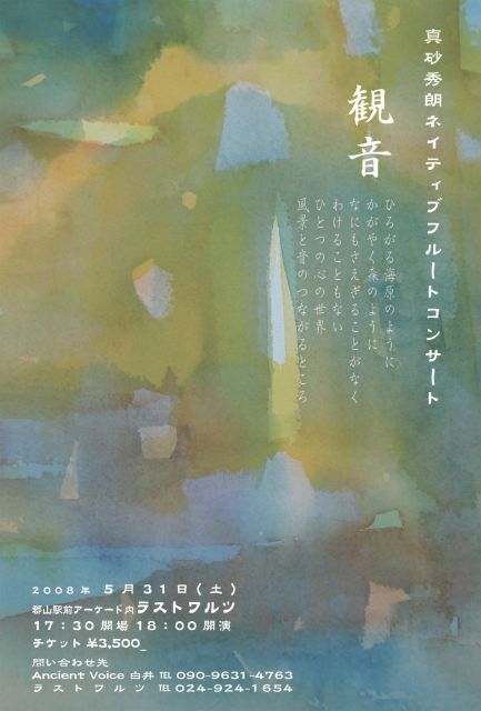 真砂秀朗ネイティブフルートコンサート .........観音................. ひろがる海原のように かがやく森のように なにもさえぎることがなく わけることもない ひとつの心の世界 風景と音のつながるところ 時/5月31日(土) 場所/郡山駅前アーケード内ラストワルツ 18:00会場 18:30開演 チケット/¥3500 ※真砂秀朗 (インディアンフルート、バンブーフルート、パーカッショ ン) 「自分の中に流れているスピリットに気付いて行く事。 同調して行く事、 そしてそれを表現して行く事。」 独自の音楽