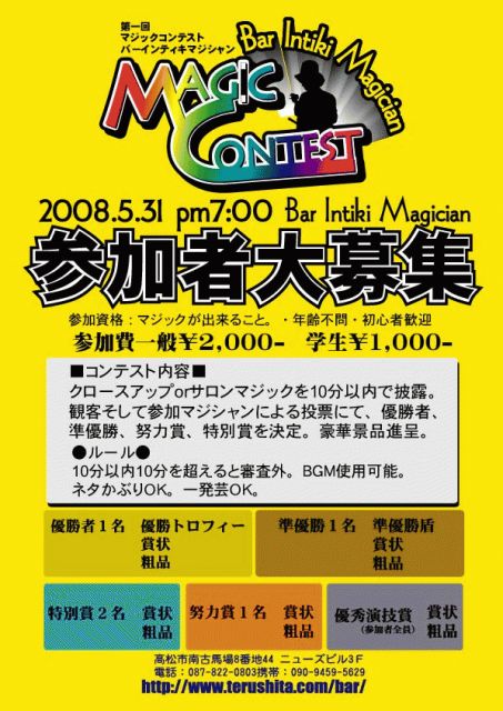 来る5月31日に、バーインティキマジシャンで、マジックコンテスト開催!!! ■コンテスト内容■ クロースアップorサロンマジック10分以内で披露。 観客(居たら)参加マジシャンによる投票にて、優賞、準優賞、努力賞、特別賞を決定。豪華景品進呈。参加賞あり。 ●ルール● 10分以内10分を超えると審査外。BGM使用可能。 ネタかぶりOK。一発芸OK。酔っ払いNG。 参加費一般¥2,000-(飲み放題) 学生¥1,000-(ジュースの見放題&立ち見でオネ^^)