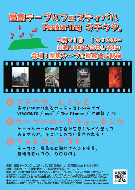 屋島テーブルフェスティバル Featuring マチウタ。 概要・趣旨 1929年に運行開始し2005年に廃止された屋島ケーブルカーの駅舎である屋島山上駅と屋島登山口駅。ケーブルカーの廃止に伴い廃屋となっている。 屋島は、高松市民のシンボルであり、県民の貴重な自然の財産との認識に立ち、既存施設の再利用を中心に、民間や市民のアイデアを生かすべきではないかという熱い想いを持つ人々がたくさんいます。それぞれがバラバラに動くのではなく、一つのテーブルに集って話し合えたなら。また、行政と民間が同じテーブルにつき話あえた