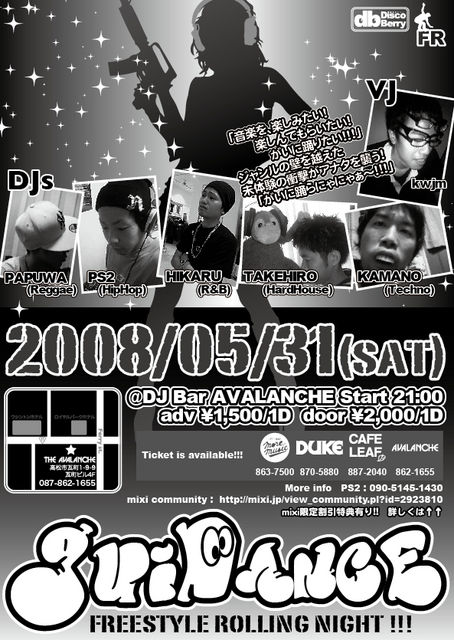 ーーーーーーーーーーーーーーーーーーーーーーーーーーーーーーーーーーー Freestyle Rolling Night !!! [ GUIDANCE ] 5月31日(土) 21:00〜 @DJ Bar AVALANCHE 高松市瓦町1-9-9 瓦町ビル4F 087-862-1655 前売\1,500/1Drink 当日\2,000/1Drink =============================== 先着でメンバーのオイシイトコだけかいつまんだMixCDプレゼント! 早い者勝ちです! =============================== Djs KIDS(HipHop) HIKARU(R&B) PAPU