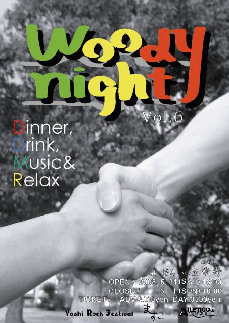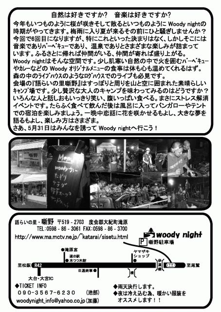 いよいよWoody nightの季節がやって参りました!! 今年もやります。 ☆★☆Woody night Vol.6☆★☆ 『Woody night Vol.6』 日時:2008年5月31日(土)〜6月1日(日) OPEN/START 18:00〜 TICKET 前売 3,000円 当日 3,500円 場所:語らいの里 噺野 三重県度会郡大紀町滝原 よろしくお願い致します。