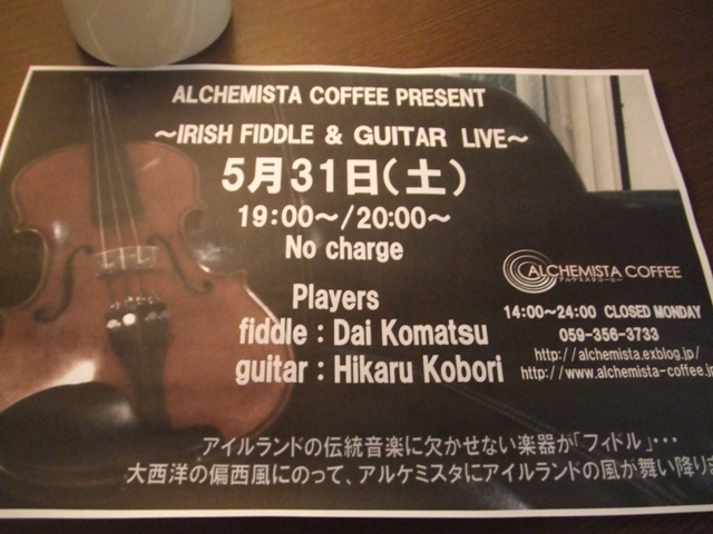 ALCHEMISTA COFFEE PRESENT IRISH FIDDLE & GUITAR LIVE アイリッシュ・フィドル&ギターライブ 5/31(Sat) 19:00~ 20:00~ No Charge Players: Dai Komatsu (fiddle) Hikaru Kobori(guitar) プロフィール:小松大×小堀光 名古屋市のアイリッシュパブで行なわれていたセッションで出会い、 ユニットを結成。 これまでに、名古屋市内のカフェやパブを中心に演奏を行っている。 小松大(Fiddle) これまでに3度アイルランドに滞在し、イーストクレア地方のフィドルを学ぶ。 名古屋市内でアイルランド音楽のセッショ