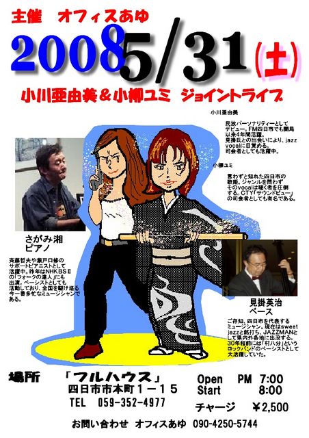 Sweet Jazz Special Live 小川亜由美&小柳ユミ ジョイントライヴ ゲスト ピアノ:さがみ湘(斉藤哲夫、瀬戸口修 サポートピアニスト) ベース:見掛英治(幻のロックバンド「村八分」の元ベーシスト) トランペット:ローディー池田(三重県を代表するトランペッター) 日時:5月31日 開場:19時 開演:20時 場所:四日市「フルハウス」 四日市市本町1−15 Tel 059-352-4977 チャージ: 2,500円