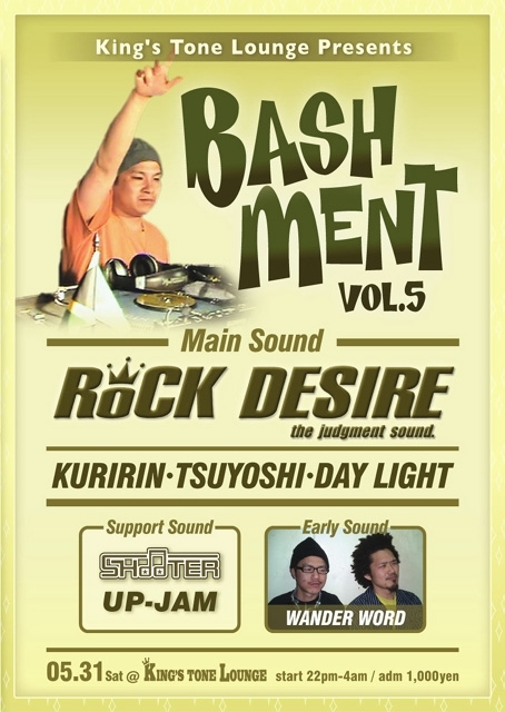 KIGS'TONE-LOUNGE PRESENTs ""BASHMENT vol,5"" mainsound !! ROCK DESIER !!...KURIRIN.TSUYOSHI supportsound SHOOTER.UP-JAM earysound WANDER WORD start,,22pm〜4am ADM....\1000
