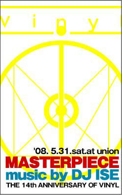 2008.05.31.Sat 「MASTERPIECE」@UNION MUSIC BY:DJ ISE DJ:TSUBASA、KATSUMI、ELETO、YUZO 21:00〜 ADM:2000yen(W/1D) W/F:1500yen(W/1D) □■MASTERPIECE 名人芸・殿堂入り・パズルの中で一番重要なピース。 現在様々な形で細分化を続けるHOUSE MUSICの中において、その歴史をふまえた上での「ルーツ」そして確実に存在する「ルール」。現在、日本の中でそれらのものを体現できる数少ないDJ、DJ ISEのLONG SET PARTY!!!! 懐古主義的なPLAYを重んじる訳でもなく、PLAYされる音楽は確実に現在進行形の「DANCE MUSIC」!!!!!!!