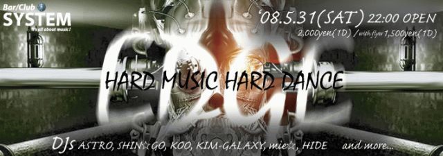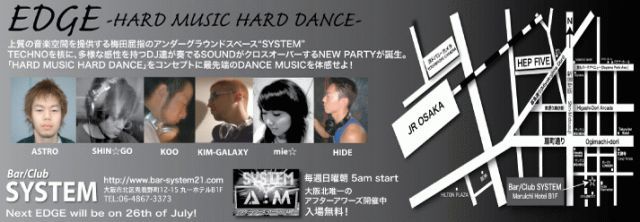 前回かなりの盛り上がりを見せたTECHNO PARTY 「EDGE」 5月は、UNDERLOUNGEのREFLEXで活躍していた「ASTRO」のHOUSE SETに、danceteria SAZA*EのTECHNOパーティーCYCLONEレジデントの「KOO」の2枚看板で、最終土曜日の31日に開催決定です。お楽しみに。 イベント名)EDGE-HARD MUSIC HARD DANCE- 開催日時)2008年5月31日(土)22時〜5時 開催場所)SYSTEM 大阪市北区兎我野町12-15丸一ホテルビルB1F TEL)06-4867-3373 *近隣にはコインパーキングも沢山有り、車での御来場も便利です。 *電車で来られる方は、梅田地下街「泉の