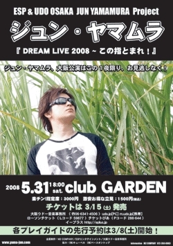 ジュン・ヤマムラ ワンマンライブ! 5.31(sat)梅田club GARDEN DREAM LIVE 2008 〜この指とまれ!〜 お待たせしました詳細が決定しました 場所:梅田 club GARDEN(ESPエンタテイメント内ホール) 開場:17:00 開演:18:00 前売: 楽チン!指定席:3000円 激安お得な立見:1500円 (当日\500 UP) ※今回は指定席を頑張って作ってみました! が、指定席は多くないので限定になるのと、 立見についてはギリギリの金額設定にしてますので すみませんが小人も同額でお願い致しますm(_ _)m そして一般発売に先駆けて、どこよりも早
