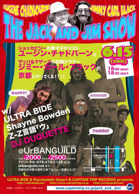 ジャックことギター怪人 ユージン・チャドボーン と、ジムこと あのFRANK ZAPPA & THE MOTHERS OF INVENTION のインディアン・ドラマー ジミー・カール・ブラック によるユニット!この2人によるハッピーで、アヴァンギャルドで、ハチャメチャなパーティ・ライヴ・ショウが、日本にやってくる!