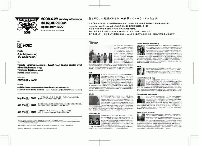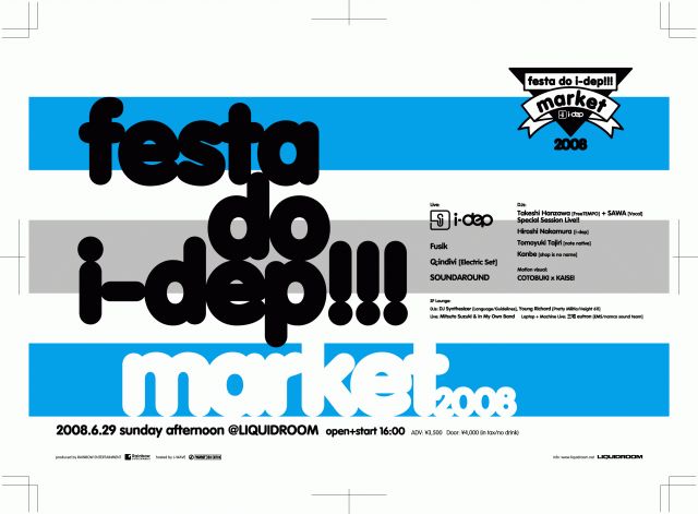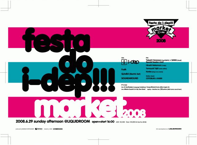 前回クラブ系アーティストとしては異例のSold out、さらに1500人を越える動員を記録したあのfesta do i-dep!!! -market-第二弾が恵比寿LIQUIDROOMで開催される!! 今年も豪華な顔ぶれが大集合!! みんな集まれ!! 詳細は下記にて!! ・日時:2008.6.29(SUN) open+start :16:00〜 ・場所:恵比寿LIQUIDROOM ・チケット:ADV/\3,500(tax in/no drink) DOOR/\4,000(tax in/no drink) ・プレイガイド:チケットぴあ/Pコード:288-544 TEL:0570-02-9999 ローソンチケット Lコード:74695 TEL:0570-08-4