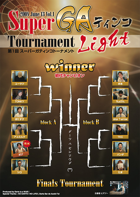 2008 第1回 スーパーGAティンコトーナメントLight 決勝トーナメント組み合わせ決定 トーナメント表(2枚目の画像)をご覧ください。 オートハンデのシングルス戦 ☆ルール 2008 第1回 スーパーGAティンコトーナメントLight 1.日程 予選 4月11日(金) 4月18日(金) 決勝 6月 13日(金)(サンパーク中央) 2.時間 集合 19: