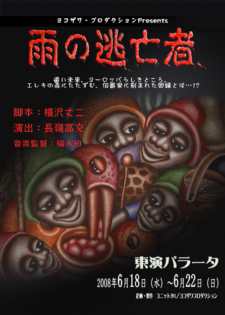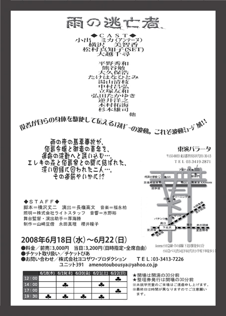 我らがたくみんこと木村拓海くんが芝居に出演します。 彼が所属するヨコザワプロダクション/ユニット391(サクイ)の公演「雨の逃亡者」です。 http://www6.vc-net.ne.jp/~yokopro/produce/200806-391.html 遠い未来。ヨーロッパらしきところ。 エレキの森にたたずむ、伯爵家に刻まれた因縁とは・・・!? 「雨の逃亡者」公演日程 6/18(水) 19:30〜 6/19(木) 14:00〜、19:30〜 6/20(金) 19:30〜 6/21(土) 14:00〜、19:30〜 6/22(日) 12:00〜、17:00〜 会場:東演パラータ@下北沢 チケット料金:前売り3,000円、当日3,200円