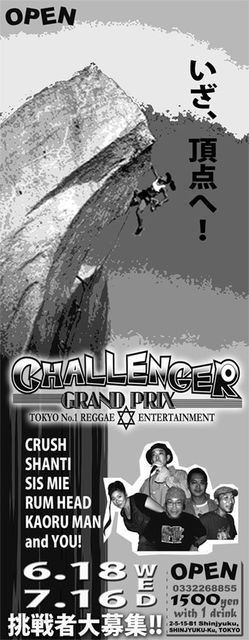 DJ出場者募集 チャレンジャーGP[グランプリ] 参加費¥1500円(1DRINK+秘密の夜食付き) ・チャレンジャーは、引き続き従来のルールと同じジャッジシステムです。 チャレンジャー[GP]では チャレンジャーの皆さんが、DJプレイ際に、、、 セレクションキーワードをくじ引きで決めて、、、 見事キーワードをDJセレクションで的中すると素敵なプレゼントをご用意しております。 ゲーム感覚の、DJプレイに大好評イベント!もちろん青汁も用意しておりますよ!! 是非皆さん参加して下さいねぇ〜