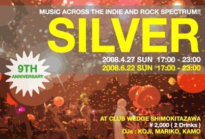 掲示板にも告知しておりましたが、6月のSILVERは9周年であり、DJの家庭の事情により6月をもってイベントを休止することになりました。 9年間の感謝の意をこめて、SILVER DJ陣勢ぞろいで華やかに盛り上げていきたいと思っています。今回は開始当初からのKOJI,MARIKO,KAMOの3人のほか、前回も久々にDJをしてフロアを沸かせてくれたTATSUYUKI(2001年2月〜2004年3月)や、今、オーストラリアに留学中のMITCHIN(2004年3月〜2007年2月)も参加しますのでお楽しみに。 2008年6月22日(日) 17:00〜23:00 @CLUB WEDGE(SHIMOKITAZAWA) 2000Yen 2Drinks DJ