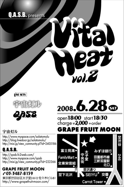 Q.A.S.B.主催イベント『Vital Heat』の第二弾です! 「70年代black musicをrespectするリスナーが気軽に来て楽しめる、 本格的で質の高い音楽空間を提供したい!」 というコンセプトを元にお届けする本イベント。 今回のゲストは・・・ 「宇宙灯ル」さんです。 すばらしい歌、そしてすばらしいサウンド。 ぜひ堪能していって下さい! 共演が今からとっても楽しみです。 ++++++++++++++++++++++++++++++++++++++++++++++++ Vital Heat Vol.2 【日時】 2008年6月28日(土) Open: 18時00分
