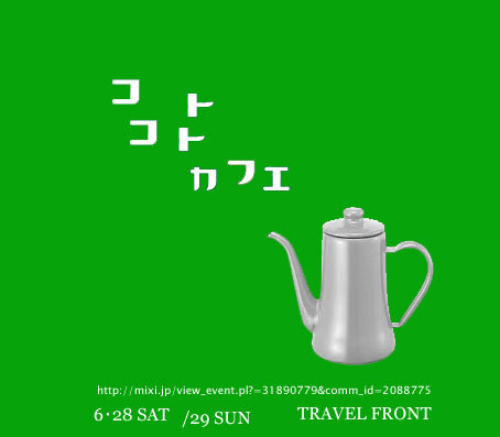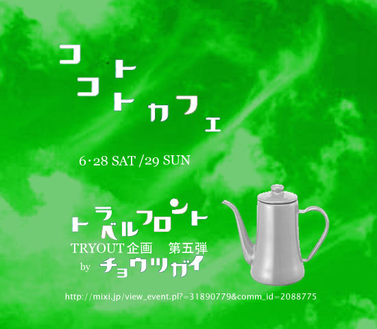 皆様、お元気でしょうか?? 遊んでますでしょうか?? さて今回はお世話になっている冷泉荘TRAVEL FRONT企画TRYOUT第五弾!「言言カフェ」(コトコトカフェ)をやっちゃいま〜す 「言言カフェ」(コトコトカフェ)とは??? 言は「言葉」の言。あい、そのまんまでし その言葉にまつわるあれやこれで楽しむ2日間。 どうぞ言葉と戯れに冷泉荘TRAVEL FRONTにお出かけ下さい TRYOUT第五弾!「言言カフェ」(コトコトカフェ) 日時:6月28日(土)29日(日)12:00〜19:00 言1日目 言