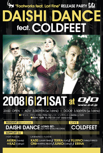 管理人様、イベント告知失礼いたします。 福岡で今回で3度目のDAISHIDANCEのレギュラーイベント があります! 今回はCOLDFEETも登場します!!! ◆詳細◆ 2008.6.21 場所・・・@O/D(福岡市) 『Footworks feat. Lori Fine』RELEASE PARTY!!! DAISHI DANCE feat. COLDFEET!!!! ■GUEST DJ DAISHI DANCE!!! ■LIVE COLDFEET!!!! ■DJ KASE(LUXURY
