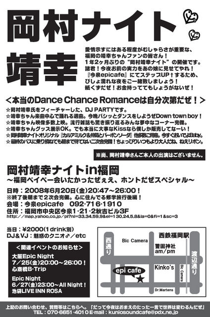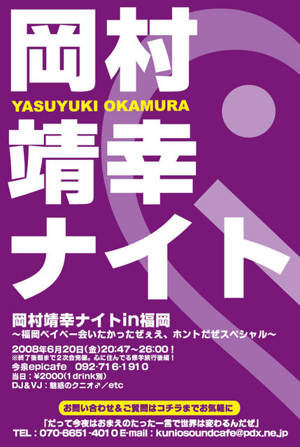 お世話になっております。 コンサートの代わりになるとは思いませんが、 なんにもしないのも切ない気持ちですのでこちら。 久しぶりに福岡開催のお知らせです! “岡村靖幸ナイトin福岡” 〜福岡ベイベー会いたかったぜぇえ、ホントだぜスペシャル〜 日時:6/20(金)20:47〜26:00! ※終了後朝まで2次会完備。心に住んでる修学旅行後編! 会場:今泉epicafe 092-716-1910 住所:福岡市中央区今泉1-21-2秋吉ビル3F http://map.yahoo.co.jp/pl?nl=33.34.59.9&el=130.24.5.8&la=0&fi=1&sc=3 当日:\2000(1drink別) DJ&