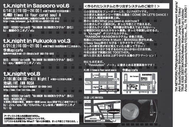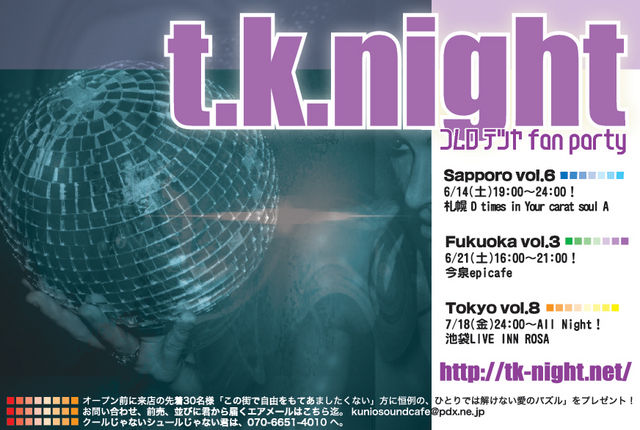 お世話になっております。 haru☆さんの情熱のリクエストもあり、 一年二ヶ月ぶりの“t.k.night”福岡開催を決定致しました! 今回もDJ Timeを中心に、 TK Soundの鳴り渡るフロアを体感頂ければと考えております。 お店はお食事も出来るカフェですので、 本編中は上映の映像を見つつお過ごしになるのも可能ですよ。 充実の夜をご用意しお伺いしますので、 是非ともお誘い合わせの上お付き合い下さいね! “t.k.night in Fukuoka vol.3” 日時:6/21(土)16:00〜21:00!※終了後23:00迄同会場で二次会あり。 会場:今泉epicafe 092