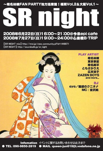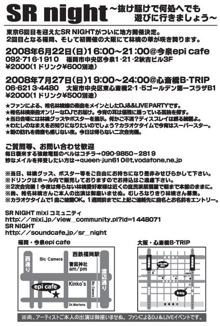 大変お待たせ致しました。 椎名林檎界隈の楽曲で踊り明かす“SR NIGHT”が、 6回の東京開催を経て福岡に帰って来ます! -------------------------------------------------- 【SR NIGHT 其の弐 〜今夜只責められたひ〜】 日時:6月22日(日)16:00〜21:00! ※2次会もご用意! 会場:今泉epicafe 092-716-1910 住所:福岡市中央区今泉1-21-2秋吉ビル3F http://map.yahoo.co.jp/pl?nl=33.34.59.9&el=130.24.5.8&la=0&fi=1&sc=3 料金:報酬は入社後平行線な\2000(1ドリンク別途) DJ:eye/魅惑のクニオ♂ MC:宮沢純