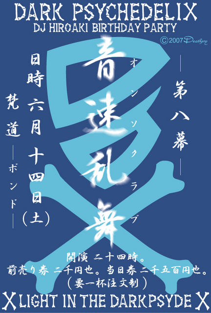 BONDが贈る・・・ UNDERGROUND DARK PSYCHEDELIX DANCE PARTY、音速乱舞。 今回で八回目を迎えます。回を重ねる毎に熱狂的なダンサーを生み出しております。 「 踊る」という目的の為のみに進化、存在するサウンド、DARK PSYCHEDELIX。 未体験の方は是非、この第二の革命、「DARK」にご参加ください。 お待ちしております 日時:六月 十四日(土) @梵道(BOND) 開演:二十四時。 前売り券 二千円。当日券 二千五百円。(要一杯注文制) ● DJZ LZZ38( rockdenashi.com ) KZ ( WILD SEVEN rec/KARAHANA/rockdenas
