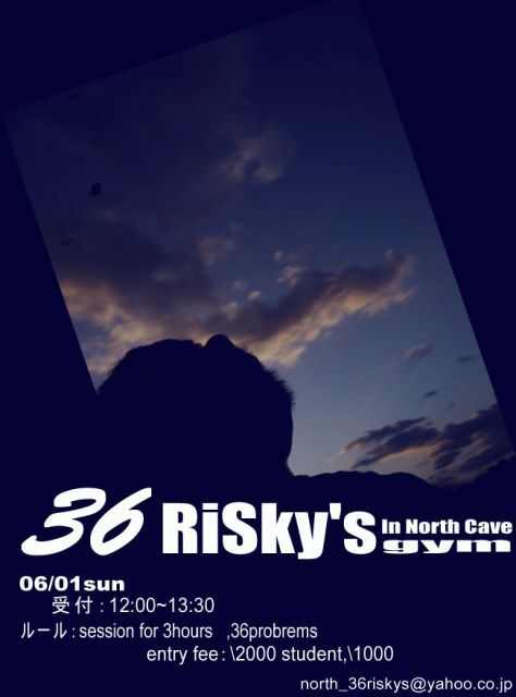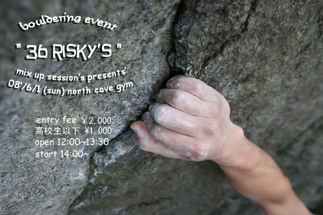 告知 〜bouldering event〜 " 36 risky's " ■主催 north cave gym / mix up session's ■開催日時 08'/6/1 (日) ■開催場所 north cave gym ・ 札幌市東区 北27条東20 ・ 最寄駅 地下鉄東豊線 元町駅〜徒歩10分。 ・ 駐車場が大きくないので、乗り合わせて来てください。 (当日車で行くぜ!って人は参加申し込みアドレスにちょいと書いておいてくれると助かります。いや俺はチャリで!って人も書いておいてくれてもいいけどねー 笑) ■entry fee ¥2,000 高校生以下 ¥1,000 (未成年ご