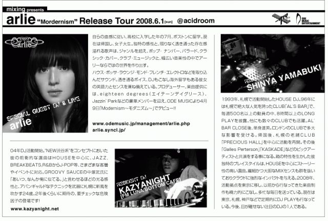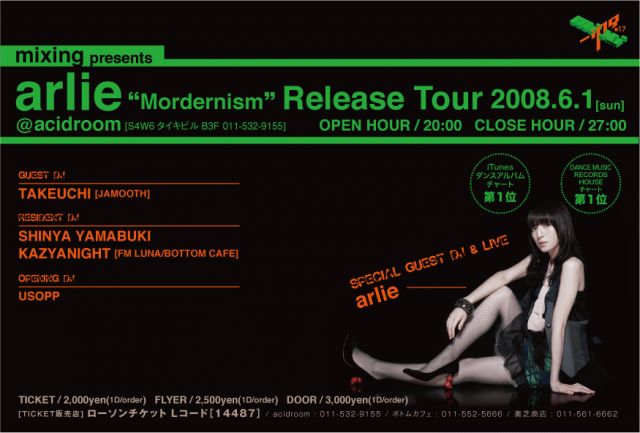 ■■■■■■■■■■■■■■■■■■■■■■■■■■■■■ mixing presents 「arlie〜Mordernism〜Release Tour」 2008/06/01 @acidroom(s4w6 タイキビル B3F) Open Hour 20:00 Close Hour 27:00 SPECIAL GUEST DJ&LIVE:arlie (ODE MUSIC ENTERTAINMENT) GUEST DJ:TAKEUCHI (JAMOOTH) RESIDENT DJ:SHINYA YAMABUKI KAZYANIGHT(FM LUNA/BOTTOM CAFE) OPENING DJ:USOPP VJ:MORICH ローソンチケットLコード:14487(2,000yen) ticket:2,000 flyer:2,500 door:3,000(ALL 1DRIN