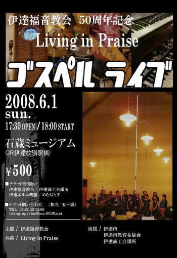 伊達福音教会50周年記念ゴスペルライブ 日時:2008年6月1日(日) 17:30開場 18:00開演 会場:伊達石蔵ミュージアム 入場料:¥500
