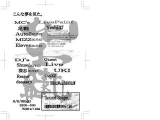 こんな夢を見た。 2008.6.6(金) 22:00〜5:00 ¥1500w/1D @Sound Scape MC’s 足軽 Auto2(C.T.C) MIZZ(C.T.C) Eleven(C.T.C) LivePaint Yoshi47 DJ’s Shusei(C.T.C) 深志(C.T.C) Reaper daaaaap Guest Live UKI CANDLE TENDALOW a.k.a SAWATALOW Sound Scape 長野市北石堂町1414−1 5F