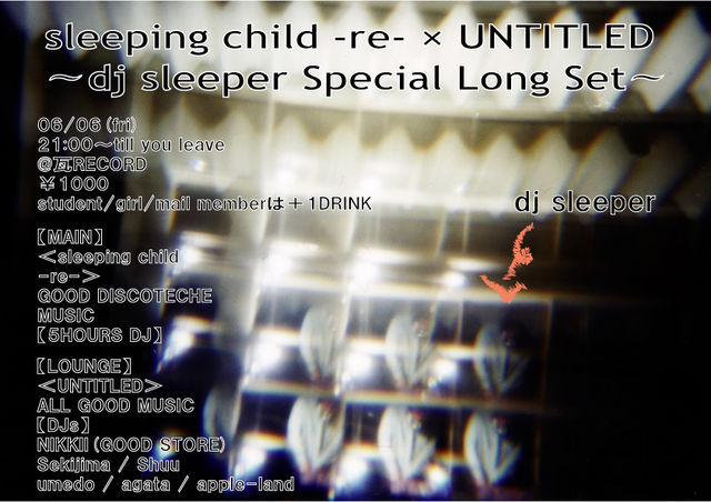 ◆sleeping child -re- × UNTITLED 〜dj sleeper Special Long Set〜◆ 【DATE】 06/06(fri) 21:00〜till you leave 【参加費】 ¥1000 student/girl/mail memberは+1DRINK [MAIN]<sleeping child -re-> GOOD DISCOTECHE MUSIC 【5HOURS DJ】 dj sleeper 【Opening DJ&VJ】 此土屋 [LOUNGE]<UNTITLED> COSMIC,DISCO,DUB,REGGAE,HIP-HOP&ALL GOOD MUSIC 【DJs】 NIKKII(GOOD STORE) Sekijima shuu umedo agata apple-land *静と動が渦巻く"sleeping child"を