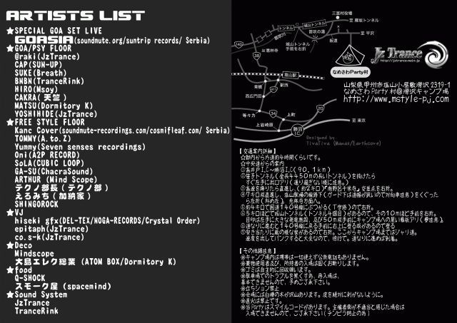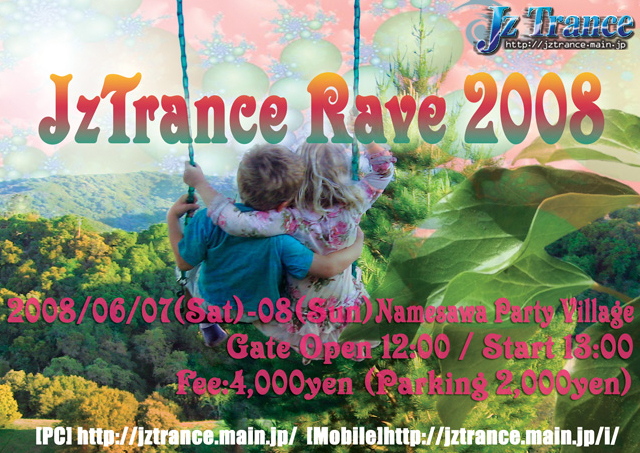 客層悪化の防止の為、自分の所のコミュニティにしか告知は してなかったんですが、先週のDTDに来てくれていた人達がHappyだったので、 こちらにも告知させて貰います♪ GOASIAの音を野外で聞けるのは、ここだけになります。 天気予報もバッチリ晴れです! ----------------- JzTrance RAVE 2008 【日時】 2008/06/07(sat)〜06/08(sun) OPEN:12:00 START:13:00 【場所】 山梨県甲州市塩山小屋敷滑沢2319-1 なめさわParty村@滑沢キャンプ場 http://www.mstyle-pj.com ※携帯電話使用できません。 【料金】