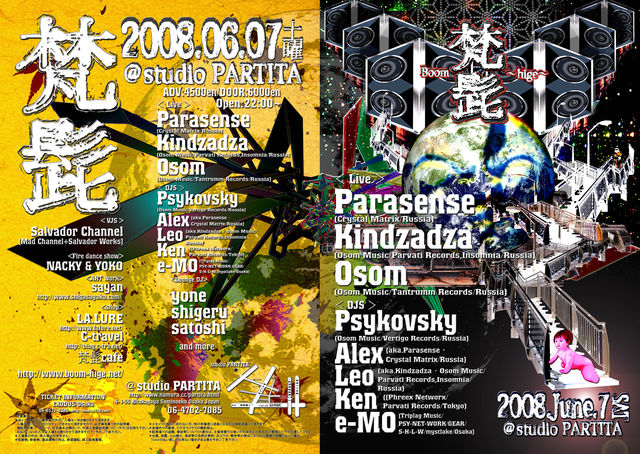 告知失礼致します。 いよいよ今週末になりました。 皆さんのお越しを心からお待ちしております 〜梵髭〜 BooM hige 2008年6月7日(土) @studio PARTITA 06-4702-7085 http://www.namura.cc/partita.html 前売り:\4,500 取り扱い店 大阪 EXODUS 06-6532-9385 http://exodus728.com/ 当日:\6,000 <LIVE> Parasense (Crystal Matrix/Russia) Kindzadza (Osom Music/Parvati Records,Insomnia/Russia) Osom(Osom Music/Tantrumm Records/Russia)