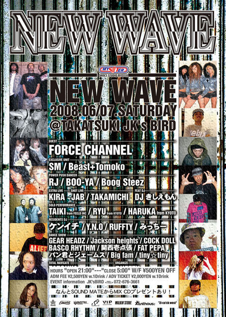 2008.06.07(SAT) NEW WAVE@高槻CLUB BIRD -SUPPORTED BY MySTER- OPEN:21:00-5:00 ADM:2500YEN/W.1D ADV:2000YEN/W.1D -CAST- ■GUEST DANCER■ FORCE CHANNEL ■EXCLUSIVE UNIT■ SM Beast+Tomoko ■EXTRA LIVE■ KIRA ■POWER PUSH DANCER■ RJ BOO→YA Boog Steez ■SOLO PERFORMANCE■ TAIKI from FEELD INC RYU from Kyoto HARUKA from Kyoto ■SHOT LIVE■ JAB TAKAMICHI ■FEAT DJ■ DJ きしえもん ■DJ 's■ ケンイチ Y.N.O RUFFTY みっち〜