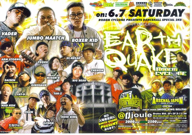 本日!! EARTH QUAKE VADER JUMBO MAATCH BOXER KID ARM STORNG PEQUU HI-BREAD DAISEN fromYOKOHAMA FAT-D frrom YOKOHAMA DINOSAUR MISON-B BIG BEAR CHEHON MAD KOH fromYOKOHAMA TAK-Z JIGEN 強 たなけん fromYOKOHAMA EJISON ZOVE KING SOUND: RODEM CYCLON Yard beat fromYOKOHAMA ARSENAL JAPAN fromMIE EARLEY WARM: SMOKE KING BELLYAS DAY: 6.7(SAT) @club joule OPEN: 22:00 ADV.2000 ADM.2500 (別途1D代500円が必要です。) その他質問がござ