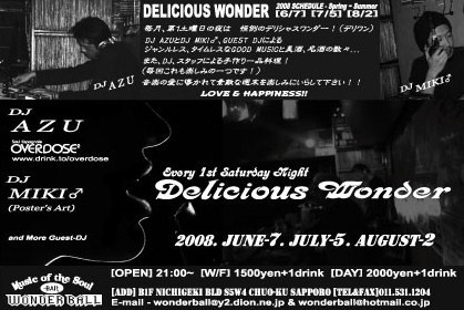午前0時も回ったので... もう5月も終わり、6月っす!! 早いですねぇ〜 もうちょっと晴れて暖かくなって欲しいものですが... 我々札幌音楽共同体は スカッとアツーく盛り上がっていきましょう ってな訳で、 6月7日<毎月第1土曜恒例!> WONDER BALLレギュラーパーティー [DELICIOUS WONDER] ありますので皆さんヨロシクでーーーーす