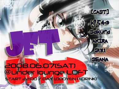 2008.06.07(SAT) JET UPPER!(HOUSE) @under lounge LOFT 苫小牧市大町1丁目4-9 SETOビル2F Contact air@mbp.nifty.com [under lounge LOFT コミュ] http://mixi.jp/view_community.pl?id=3303907 START/22:00 ADV./\1,000(with 1DRINK & 1CD) DOOR/\1,000(with 1DRINK) 前売にはDJ SEANA MIX CD付きます♪ [DJs] kj.540(5th element) Sakura(CHERRY HOUSE) AKIRA(CHERRY HOUSE) SUU(CHERRY HOUSE from 札幌) SEANA(CHERRY HOUSE from 札