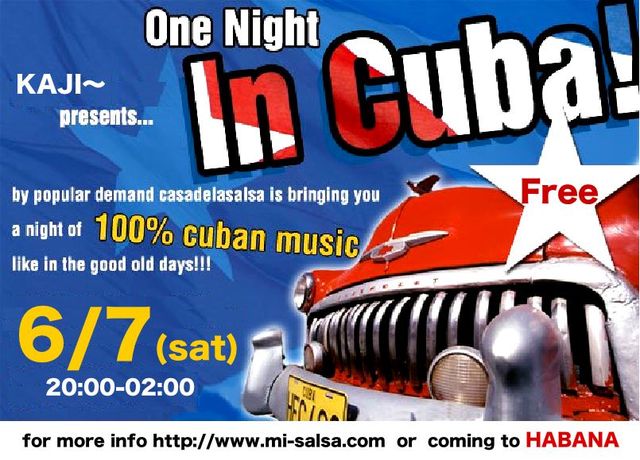 燃えてるKAJI〜が本気をだします。 今週土曜日(6/7) 『One Night In Cuba!』 すべてキューバ音楽で踊るパーティ。 サルサは勿論、メレンゲもバチャータもレゲトンもぜんぶMade in Cuba。 チャチャもマンボもチャングイもスクスクも、以下省略..... 一晩で燃え尽きます。 来てね!!