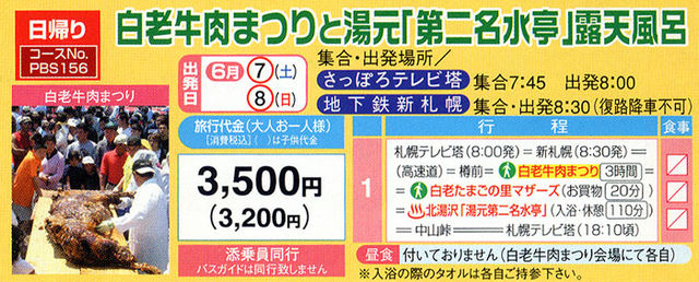 白老牛肉祭り開催 日帰りバスツアーでも申込受付しております。 今のところ、ワタクシとみあちゃんとかなは確定♪(バスではなく個人参加です) 他に参加希望の方は、下記から各自申込願います。 http://www.tv-travel.jp/index_bus.html テレビ塔観光 ドリームツアー 3500円で3時間滞在の上、第二名水亭の温泉付です。 現地で合流してオフ会しましょう♪ 募集期限は設定上、今月末にしますが、テレビ塔観光の申込数次第になりますのでご了承願います。